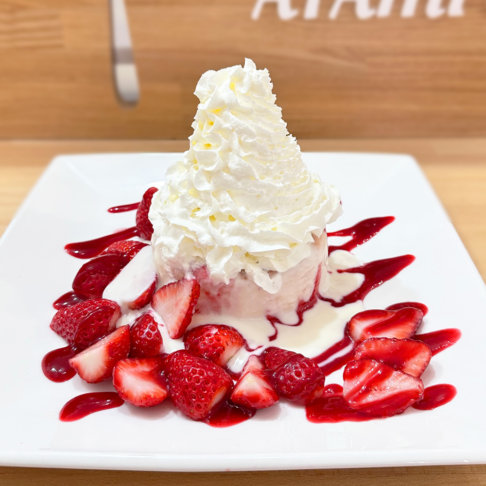 ホイップの中には、アイスクリームを忍ばせ、甘酸っぱいいちごを警沢にトッピング。ミルキーなコクといちごの爽やかさ、フランボワーズソースが絶妙に調和した見た目も可愛らしいケーキです。